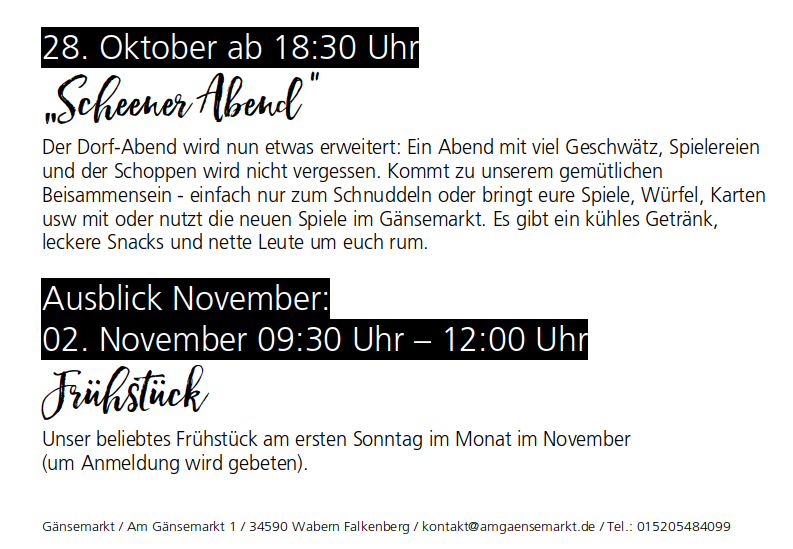 kontakt@amgaensemarkt.de oder 015205484099