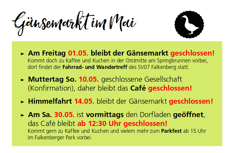 Der Gänsemarkt ist ein Projekt der Firma SHIFT. Wir fühlen uns tief verbunden mit unserer Region und in besonderer Weise mit unserem Heimatdorf Falkenberg. Es liegt uns am Herzen, die alte Tradition von Dorfläden wieder zu beleben und dabei vor allem regionale Produkte anzubieten. Mit dem Gänsemarkt wollen wir aber auch einen Ort schaffen, in dem bei liebevoll zubereitetem Essen, Limonaden und köstlichem Kaffee viele gute Begegnungen von Menschen stattfinden.