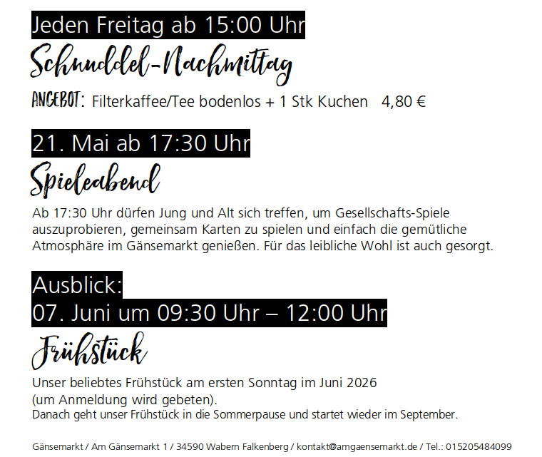 Ab 17:30 Uhr dürfen Jung und Alt sich treffen, um die unterschiedlichsten Gesellschafts-Spiele auszuprobieren, gemeinsam Karten zu spielen und einfach die gemütliche Atmosphäre im Gänsemarkt genießen.